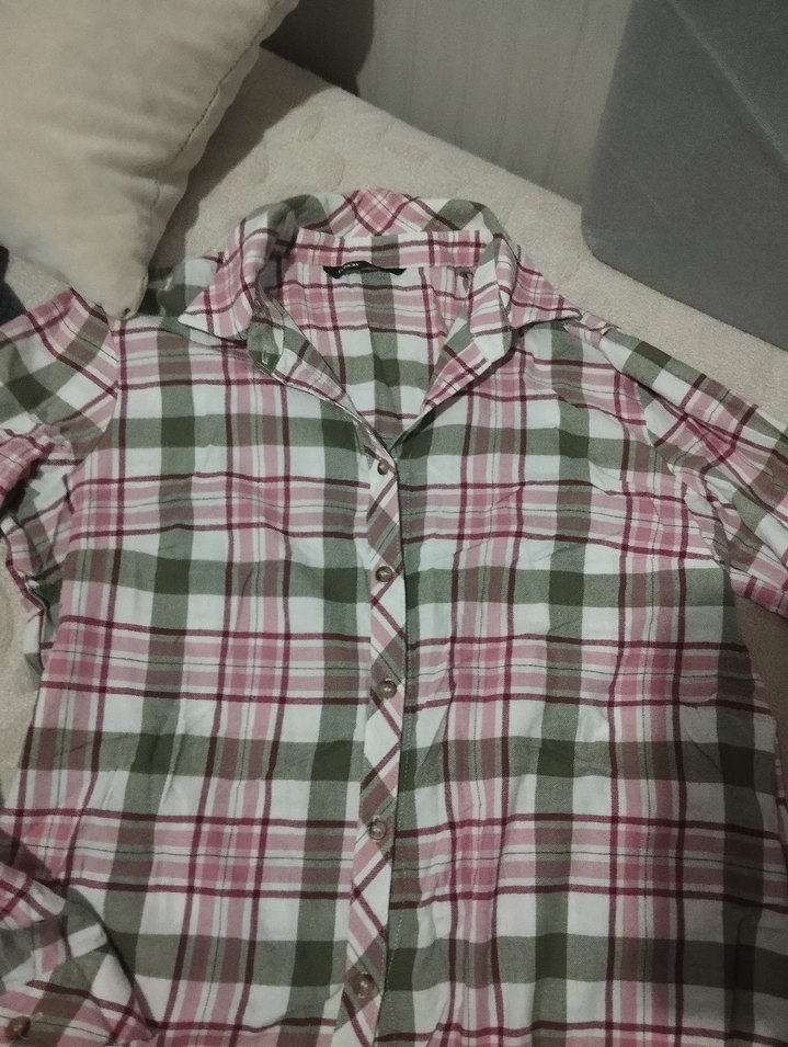 Kadınlar için çok renkli kareli pamuklu, düğmeli gömlek. Kısa kollu, yakalı ve bol kesim, rahat günlük kullanım için uygundur.