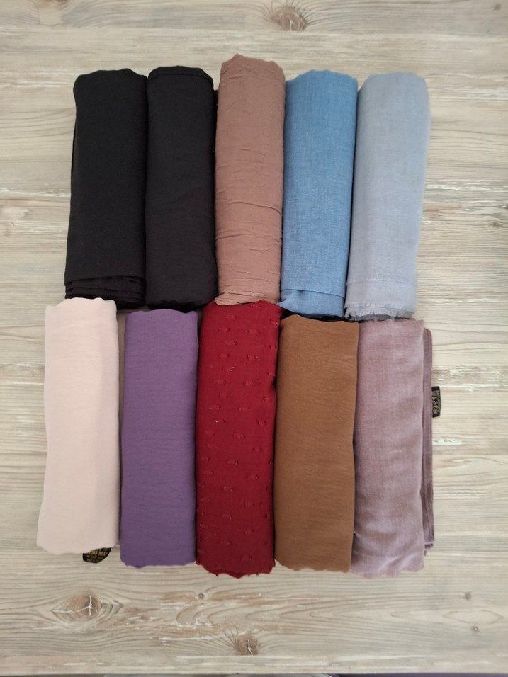 Az kullanılmış pamuklu keten kotton kumaştan üretilmiş rahat şekil alan ve kaymayan şal başörtüleri. Sadece son fotoğraftaki mavi şalda biraz leke var ama arka tarafa geliyor kullanım için engel değildir. Adet fiyatı 50tl.
