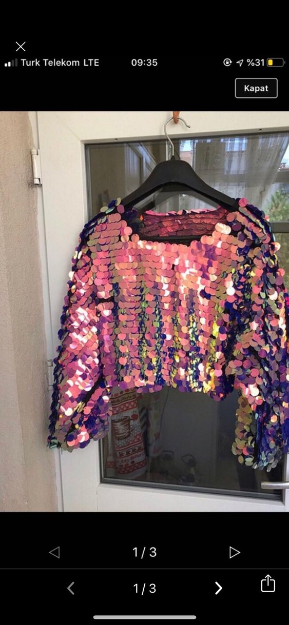 Kadınlar için uzun kollu, bol kesim ve yuvarlak yakalı bluz. Parlak, çok renkli payetlerle kaplı, canlı tie-dye görünümüyle parti için uygundur. Kısa ve avangart tarzda.
