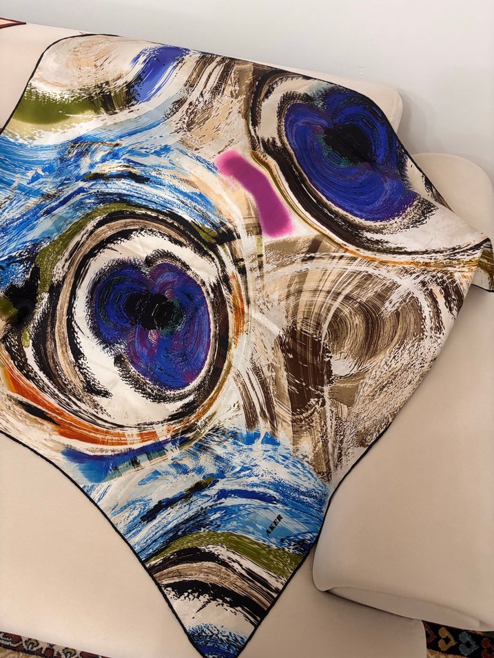 Kadınlar için çok renkli, koyu tonlarda soyut desenli, pileli ve sentetik kumaştan yapılmış çağdaş tarzda fular. Yüzde yüz ipek