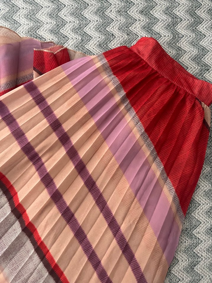 Kadın çok renkli, pileli uzun etek. Bohem tarzda, rahat kesimli ve yumuşak tekstil kumaştan yapılmıştır.