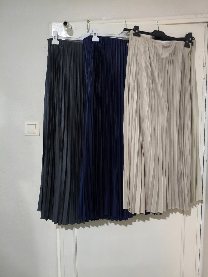 Kadınlar için çok renkli, pileli ve bol kesim uzun etekler. Sentetik kumaştan, koyu tonlarda, günlük kullanıma uygun.
