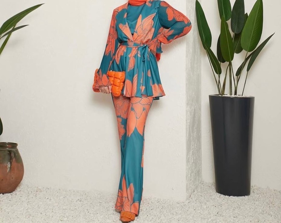 Kadınlar için uzun boy, pileli ve batik desenli takım. Çentikli yaka ve askılı kollara sahip, hafif çok renkli sentetik kumaştan. Günlük kullanım için çağdaş avangart tarz.