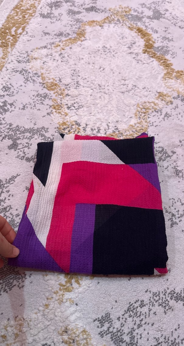 Kadınlar için pilili dokuma kumaştan yapılmış, koyu çok renkli geometrik desenli, bohem ve avangart tarza sahip eşarp.