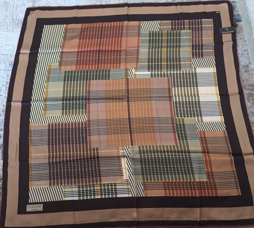 Kadınlar için koyu çok renkli kare desenli, pilili sentetik kumaştan bohem ve vintage tarzda eşarp.