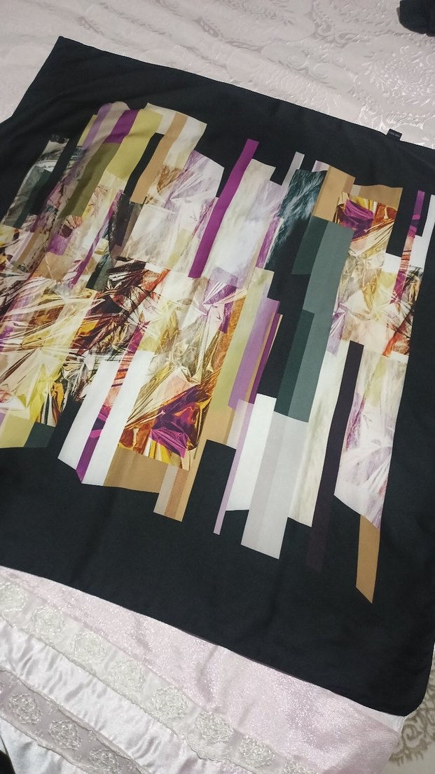 Kadınlar için çok renkli, koyu zeminli pilili tasarıma sahip, sentetik kumaştan modern fular. Avangart tarz sevenlere uygun.