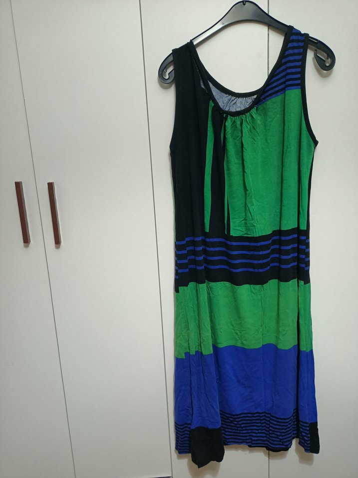 Kolsuz, bol kesim ve pilili tekstil kumaştan uzun elbise. Askısız yaka ve koyu çok renkli batik desenlidir, günlük kullanıma uygundur.
