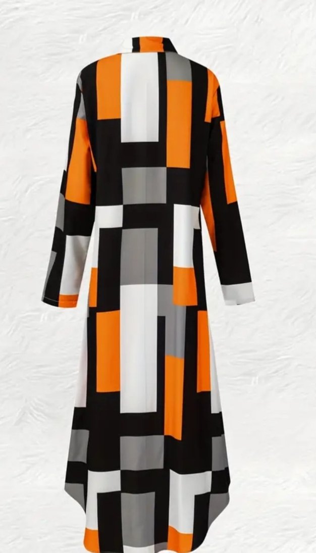 Kadın çok renkli, geometrik desenli uzun elbise, uzun kollu ve V yakalıdır. Sentetik kumaştan, pilili ve regular fit kesimdedir.