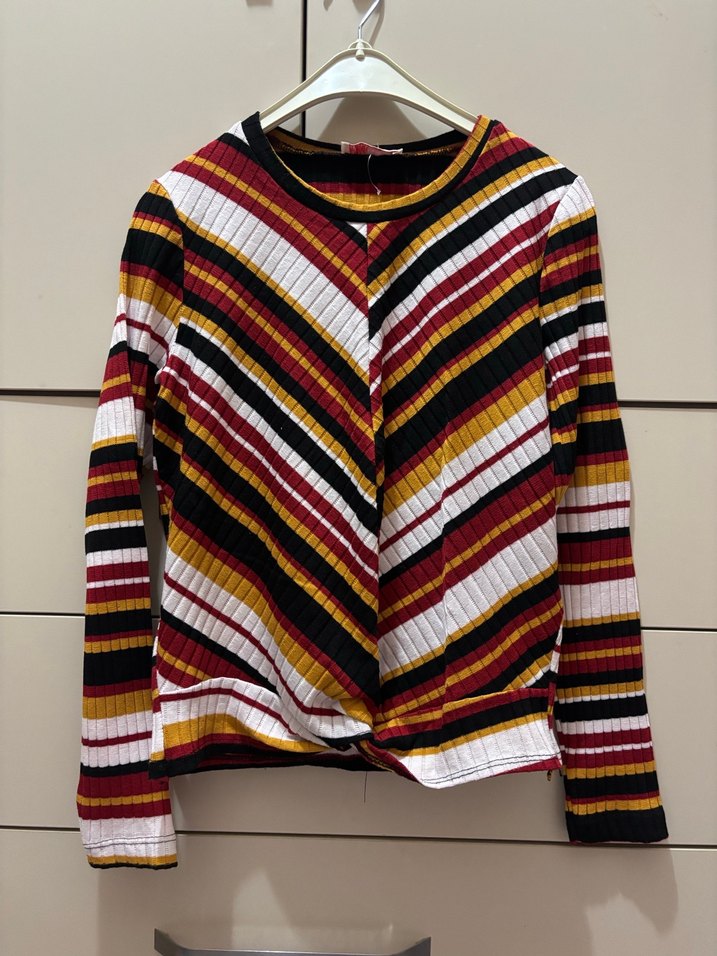 Kadın çok renkli, pilili, çapraz çizgili triko. Yuvarlak yaka ve uzun kollu, yumuşak sentetik kumaştan, bol ve midi boyda, günlük sokak stili için uygun.