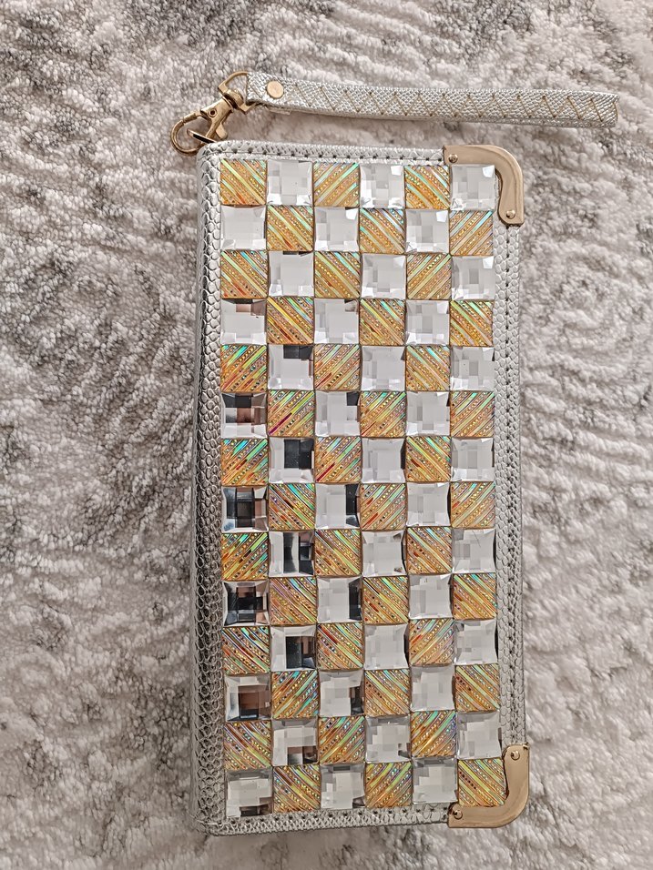 Kadınlar için çok renkli, pul detaylı kare desenli clutch çanta. ve avant-garde tarzlara uygun, günlük kullanıma ideal.