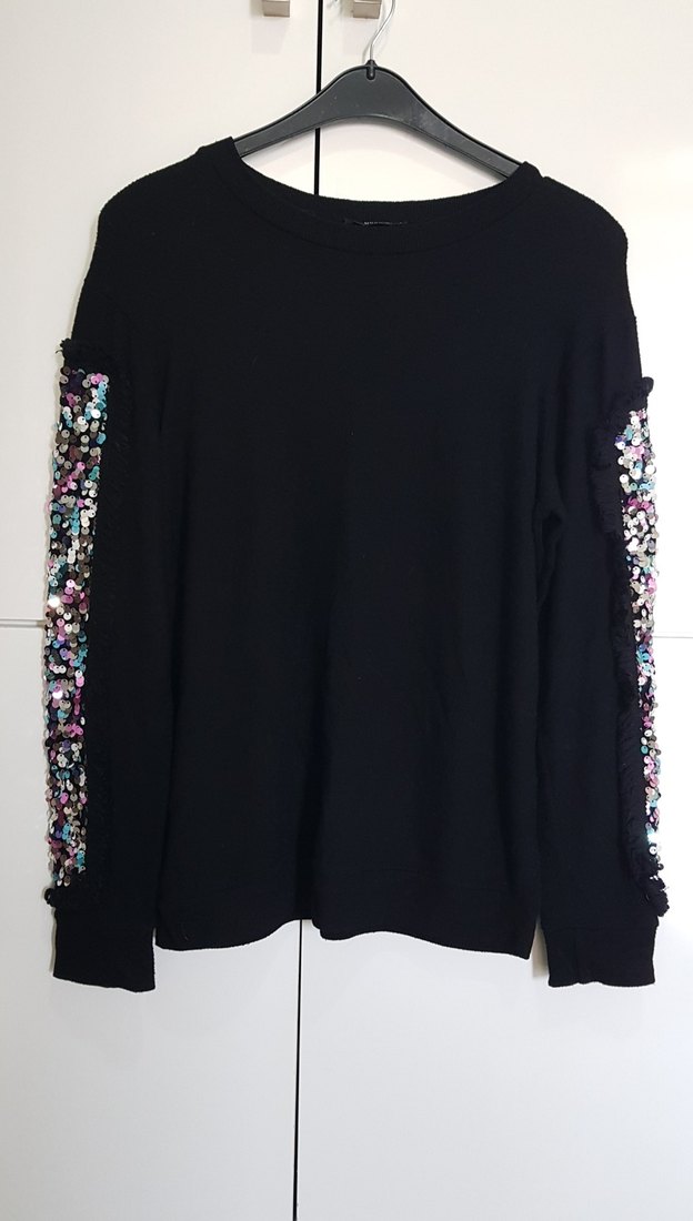 Kadınlar için uzun kollu, yuvarlak yakalı, bol kesim kazak. Sentetik kumaştan, desenli ve kollarında çok renkli pul işlemeli. Parti için uygun. ✨