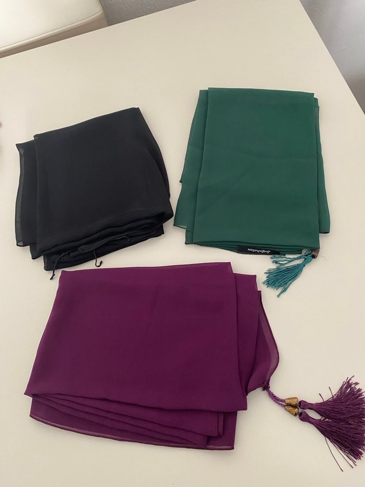 Kadınlar için üçlü çok renkli, koyu tonlarda ve püsküllü şal seti. Yumuşak sentetik kumaştan, minimalist bohem tarzda sade tasarımlara sahiptir. Şifondur