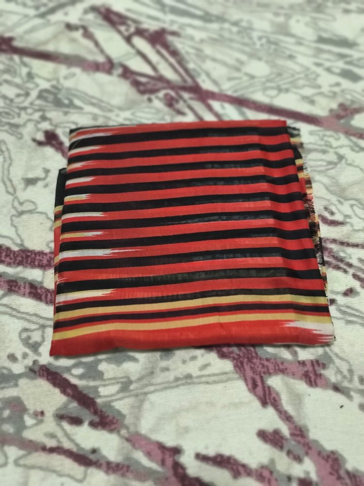 Kadınlar için çok renkli, pileli ve koyu renkli çizgili desende sentetik kumaştan yapılmış fular. Bohem, hippie ve retro tarzına uygundur.
