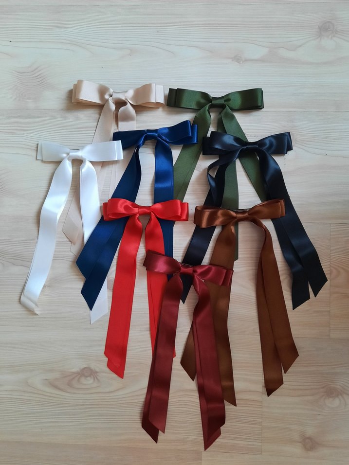 Kadınlar için çok renkli, koyu tonlarda saten kurdelelerden yapılmış, geleneksel tarzda saç aksesuarları. Paris esintili klasik dokunuş sağlar.