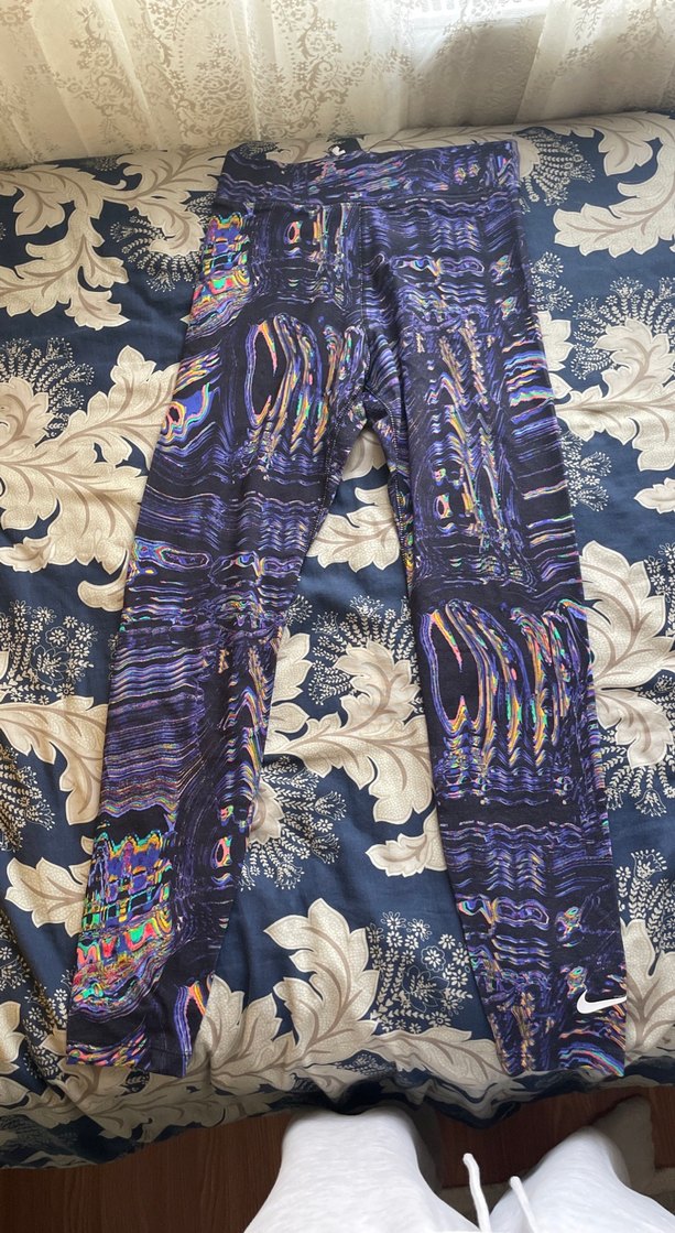 Kadınlar için elastik sentetik kumaştan, koyu çok renkli tie-dye desenli, midi boy, sıkı kesim tayt. Günlük ve sokak stiline uygun.