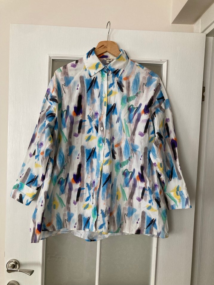 Kadınlar için çok renkli tie-dye desenli, uzun kollu ve düğmeli, salaş kesim gömlek. Günlük kullanıma uygun rahat stil.