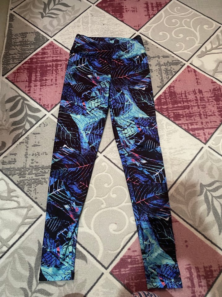 Kadınlar için elastik bel bantlı, sentetik kumaştan yapılmış, koyu çok renkli tie-dye desenli spor tayt. ♀️