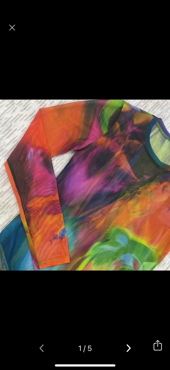 Kadınlar için tasarlanmış, uzun kollu ve yuvarlak yakalı, vücuda oturan kesime sahip transparan bluz. Canlı koyu çok renkli batik deseniyle dikkat çekiyor.