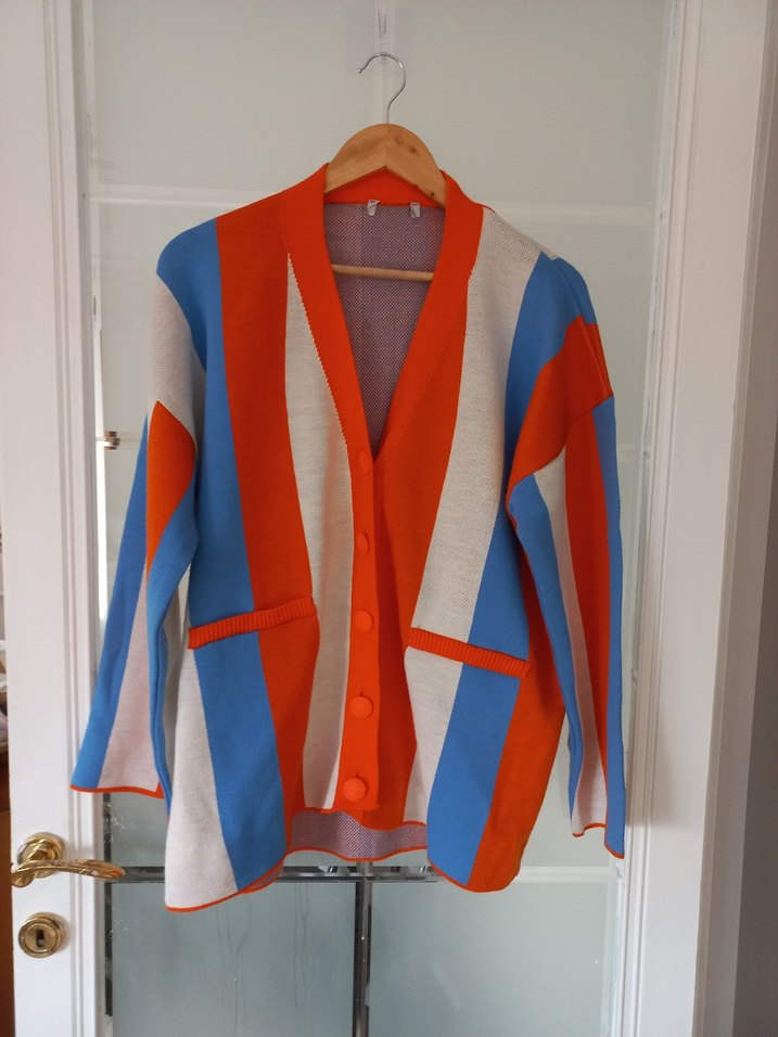 Kadın çok renkli triko hırka, bol kesim ve yakalı. Uzun kollu, midi boyda, hafif canlı renklerle çağdaş tarzda. Günlük kullanıma uygun, Paris tarzı. beden eni 63cm boyu 75cm
