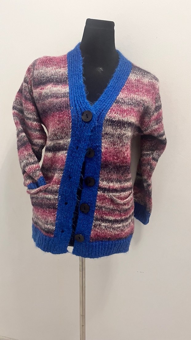 Kadınlar için bol kesim, uzun kollu, yaka detaylı triko hırka. Canlı koyu renklerde, bağlama desenli, düğmeli ve midi boyda rahat bir model.