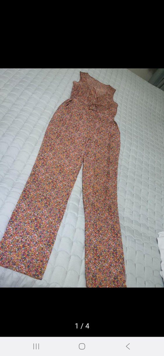 Kadınlar için askısız, V yakalı ve kemerli bel detaylı uzun tulum. Pastel tonlarda çok renkli tie-dye desenlidir belden lastikli s m uyumlu sorunsuz