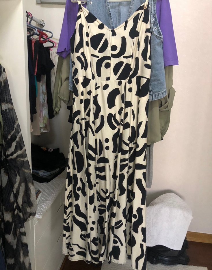 Kadınlar için uzun, bol kesim elbise, askılı ve straplez yakalı, sentetik kumaştan, koyu çok renkli batik desenli. Günlük rahat kullanım için drapeli tasarım.