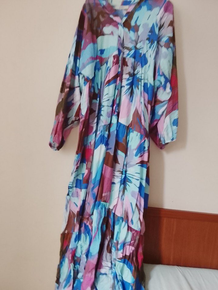 Kadınlar için çok renkli bağlama desenli uzun elbise, salaş kesim ve drapeli tasarıma sahip. Uzun kollu ve V yaka, sentetik kumaştan üretilmiştir. Bohem tarzı için uygun.