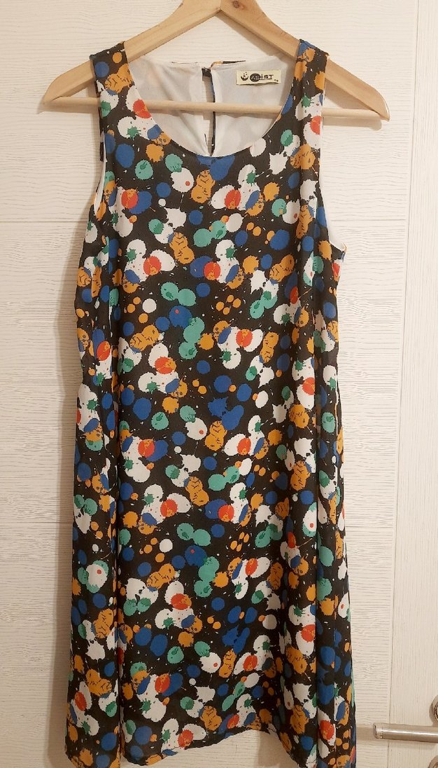 Kolsuz, uzun kesim, bol vücutlu ve yuvarlak yakalı bu elbise, çok renkli batik desene sahip. Yumuşak sentetik kumaştan, bohem tarzda drapeli.