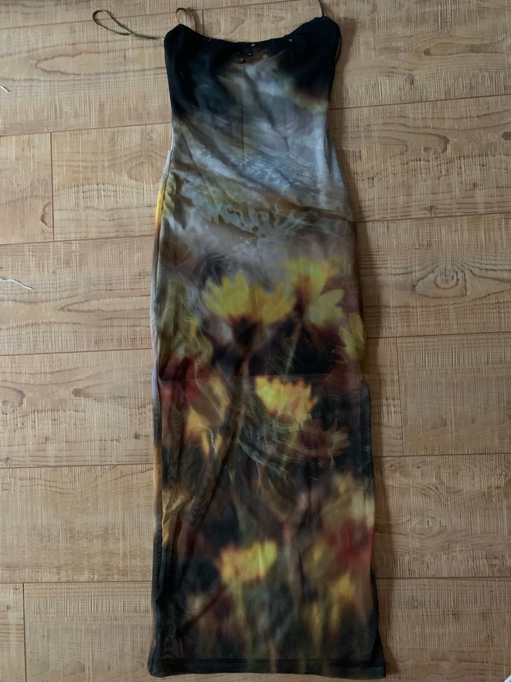 Bu kadın çok renkli, uzun ve kolsuz elbise, drapeli ve koyu tonlarda batik desene sahip. Straplez yakalı, sentetik dokulu ve bohem tarzında, açık hava kullanımı için uygun.