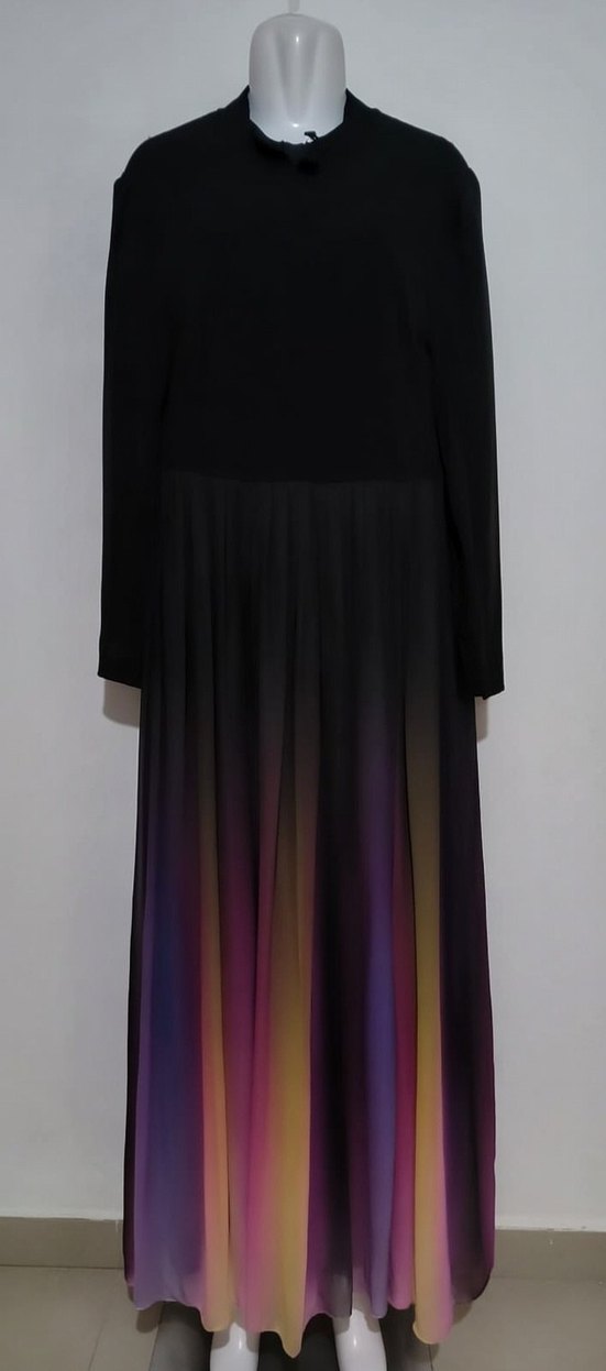 Kadınlar için uzun, bol kesim elbise, uzun kollu ve kayık yaka detaylı. İpek gibi kumaştan, koyu renkli batik desenli ve drapeli, gotik ve avangart tarzı bir arada sunar.