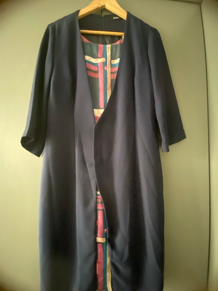 Kadın çok renkli uzun kaban, drapeli kesim ve kesik yakaya sahiptir. İpeksi kumaştan yapılmış, düzenli kesim ve çağdaş stile uygundur.