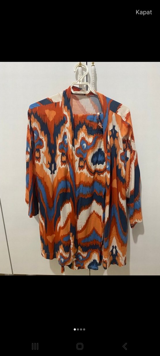 Kadınlar için çok renkli tie-dye desenli, uzun kollu, bol kesim ve drapeli kimono. Tekne yakalı ve sentetik kumaştan üretilmiştir. uygulamadan aldim bende giymedim hic