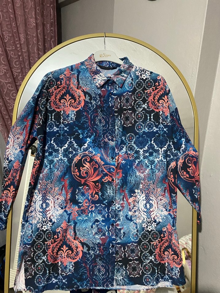 Kadınlar için çok renkli, uzun kollu, düğmeli, bohem tarzda, uzun kesim gömlek. Rahat ve bol kesim, yakalı ve tekstil kumaştan yapılmıştır.