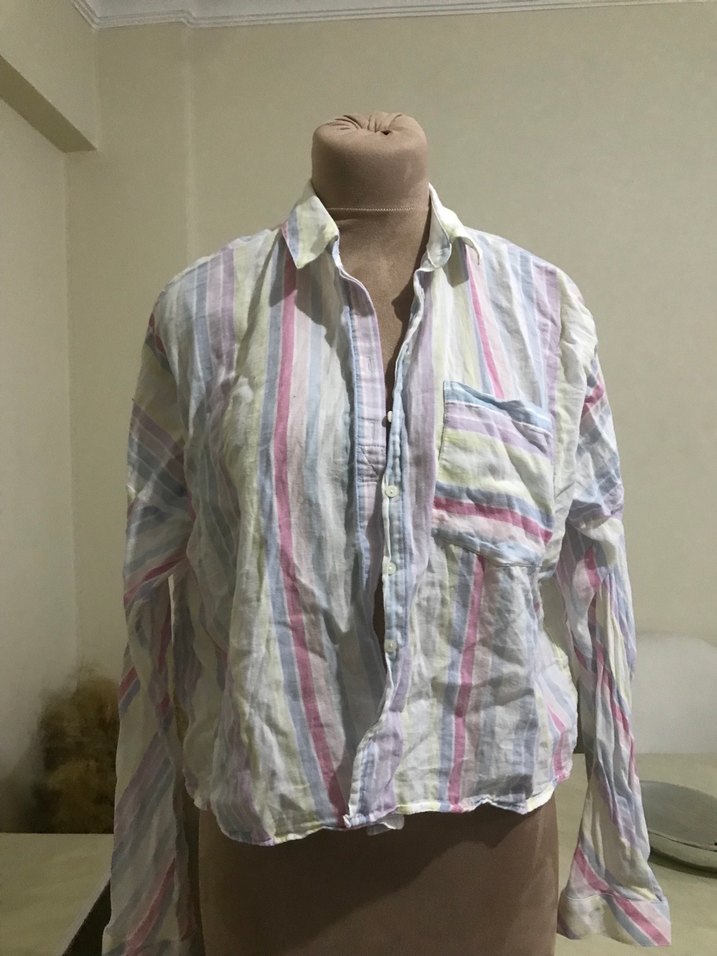 Yumuşak keten kumaştan, yakalı ve düğmeli, bol kesim uzun kollu gömlek. Çok renkli pastel batik desenli ve göğüs cebine sahip, günlük kullanıma uygun.