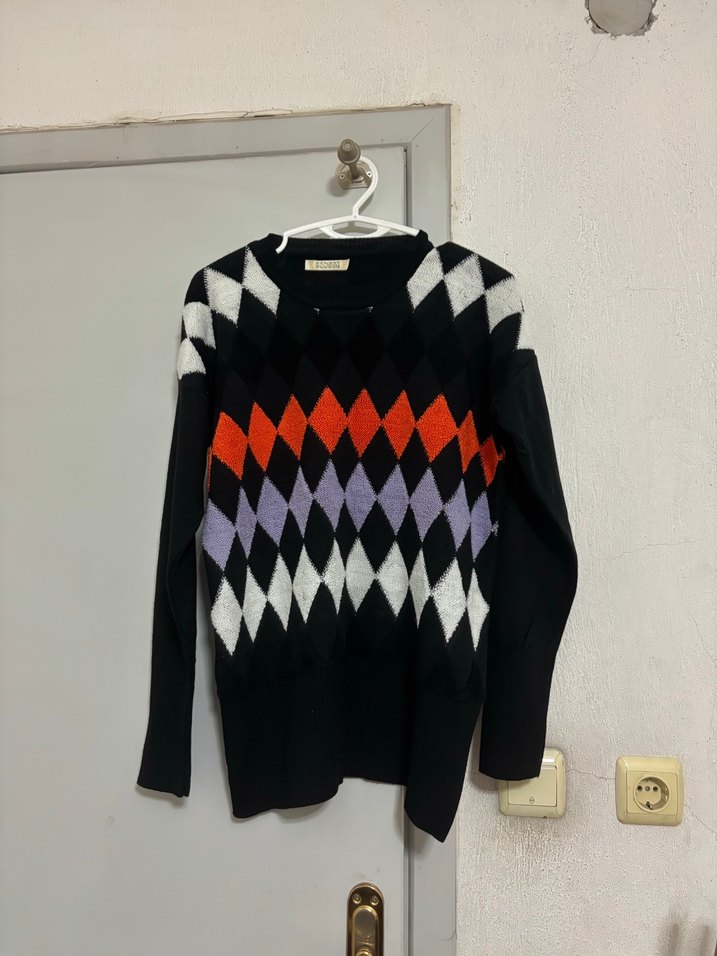 Kadınlar için çok renkli baklava desenli, uzun kollu, yuvarlak yaka ve bol kesim triko kazak. Rahat sokak stili için uygundur.