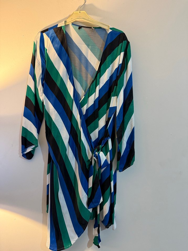Kadınlar için uzun kollu, bol kesim ve bağlamalı bel detaylı çok renkli çizgili elbise. 38 beden