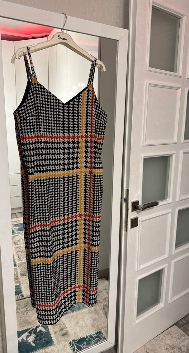 V yaka, kolsuz uzun elbise, regular fit ve piliseli tasarıma sahiptir. Koyu çok renkli kareli deseniyle günlük kullanıma uygundur. Hiç giyilmedi etiketi yok.