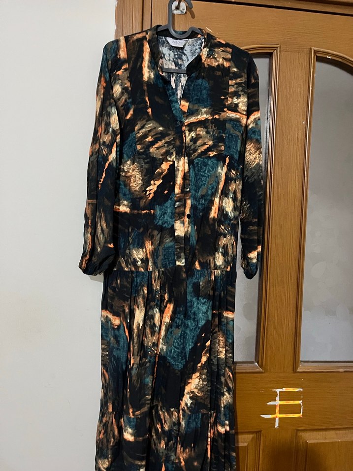 Kadın çok renkli, koyu tonlarda tie-dye desenli uzun salaş elbise. Uzun kollu, yakalı ve dökümlü tasarıma sahip, yumuşak sentetik kumaftan yapılmıştır. Bohem tarz için uygundur.