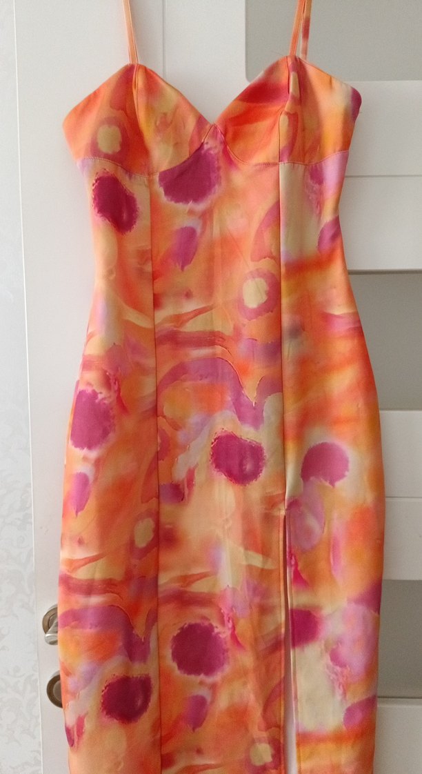 İpek gibi kumaştan, çok renkli pastel tonlarda batik desenli, straplez ve kolsuz uzun elbise. Drapeli ve vücuda oturan kesime sahip, romantik akşamlar için uygun.