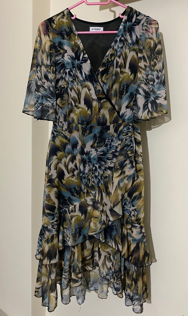 Kadın çok renkli, koyu tonlu batik desenli uzun elbise. Kısa kollu, V yakalı ve bol kesimdir. Sentetik kumaştan, fırfır detaylıdır. Günlük kullanıma uygundur. ✨ Görselde göründüğü gibidir