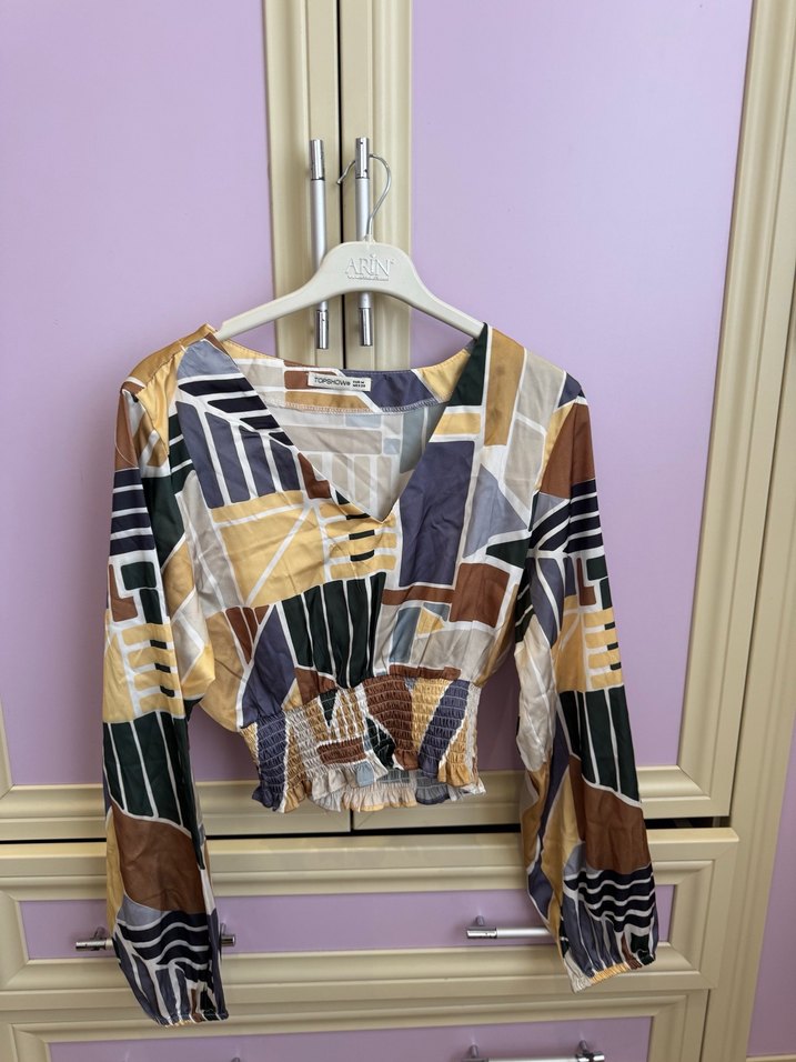 Kadınlar için çok renkli, uzun kollu, V yaka ve bol kesim kısa bluz. Drapeli tasarımı ve sentetik kumaşı ile bohem tarzı yansıtır.