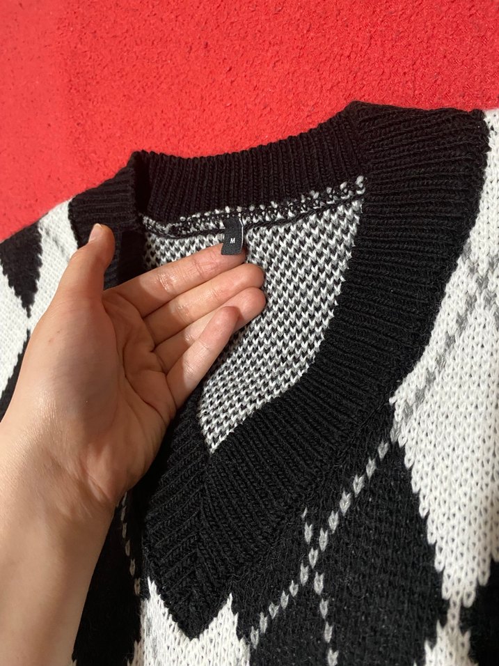Kadın çok renkli, V yaka ve fitted kesim örgü süveter. Uzun kollu, midi boyda ve rahat sokak tarzı için uygun.