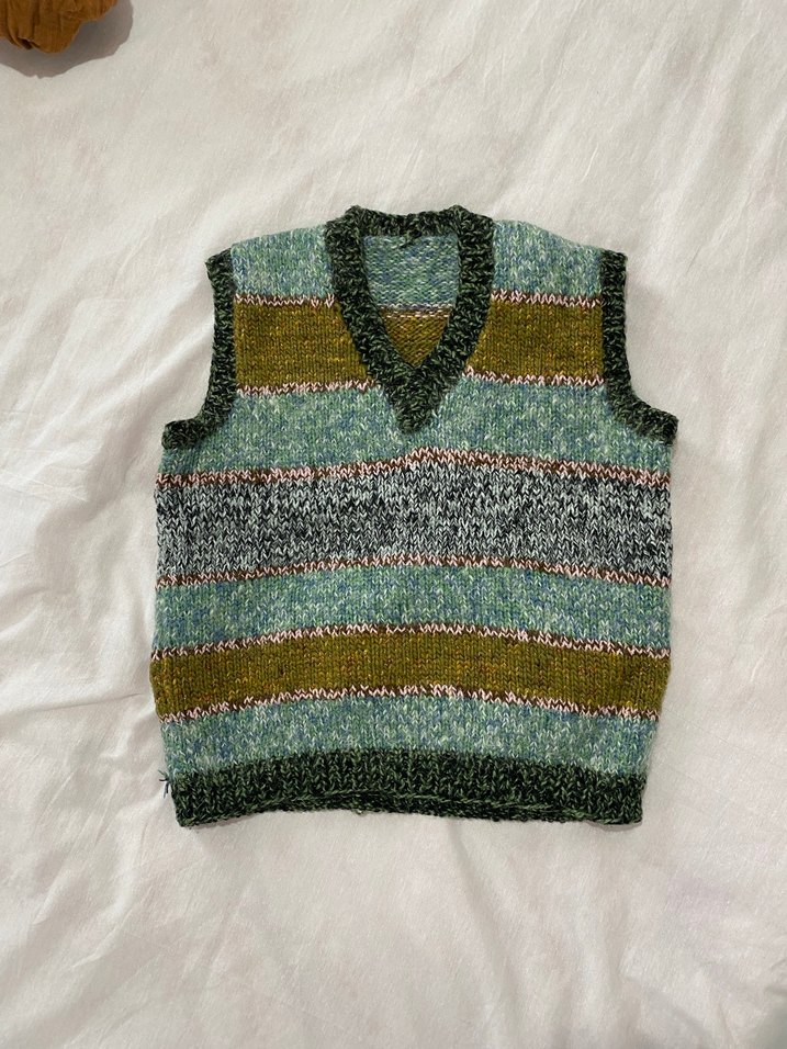 Bol kesim, kolsuz triko süveter, V yaka ve pastel çok renkli çizgilerle rahat ve bohem tarz sunar.