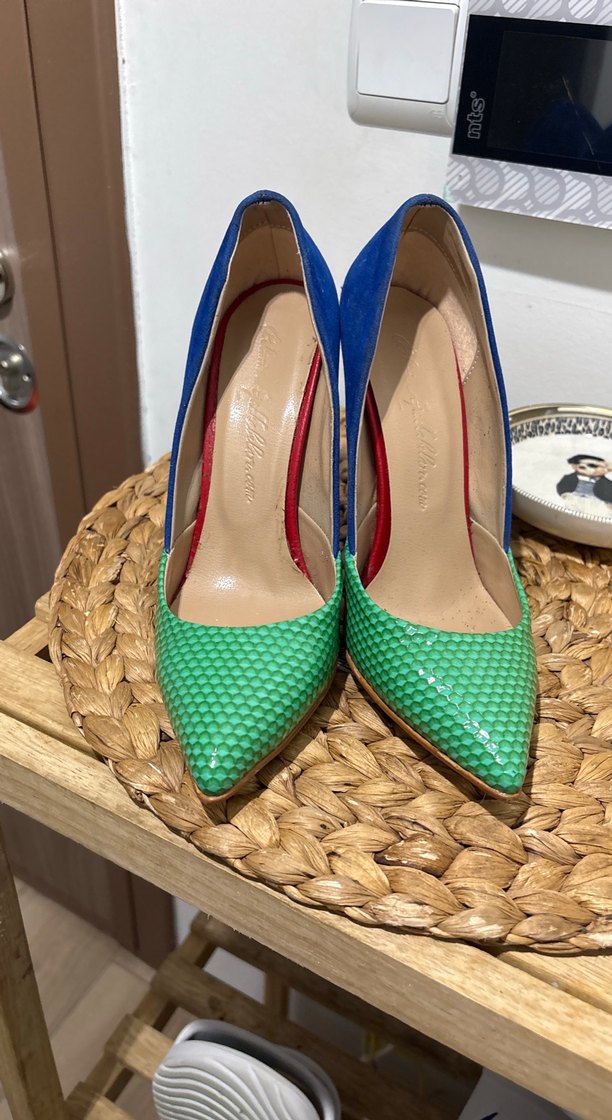 Çok renkli yılan deseni ve pile detaylı kadın stiletto, parti için uygun, kauçuk malzemeden yapılmıştır.