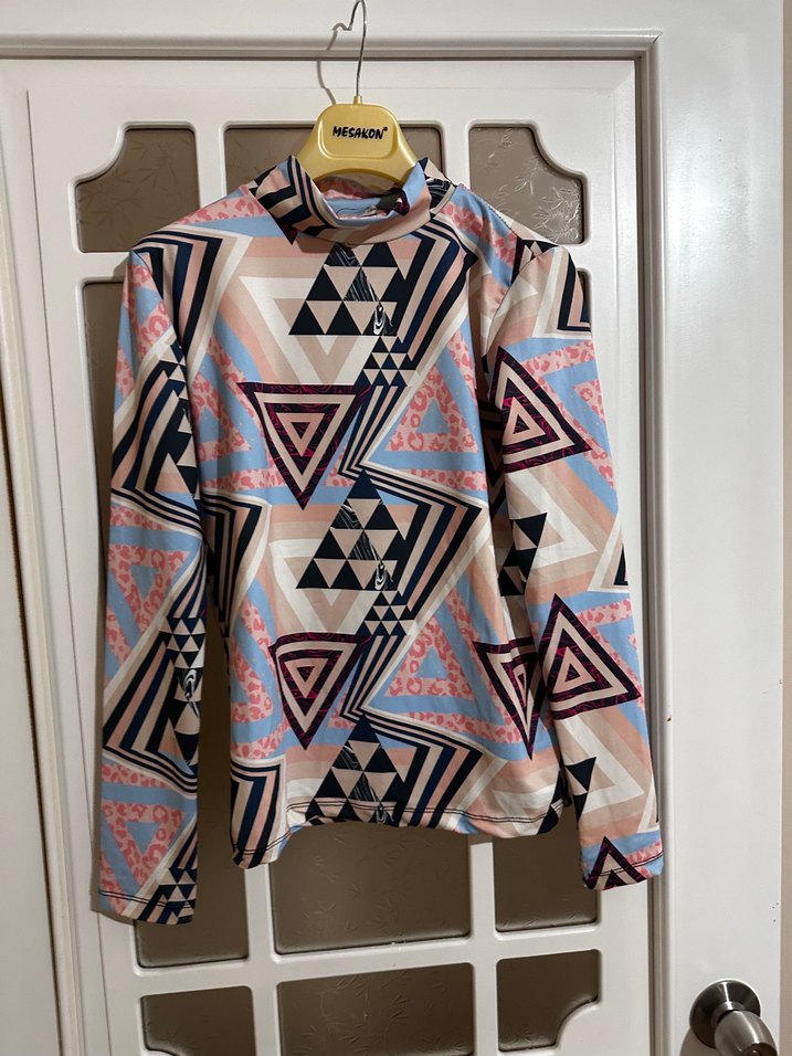 Dar kesim, yüksek yakalı ve uzun kollu kadın bluzudur. Sentetik kumaştan örme dokusuyla yapılmıştır. Pastel çok renkli geometrik deseni çağdaş bohem tarzı yansıtır.