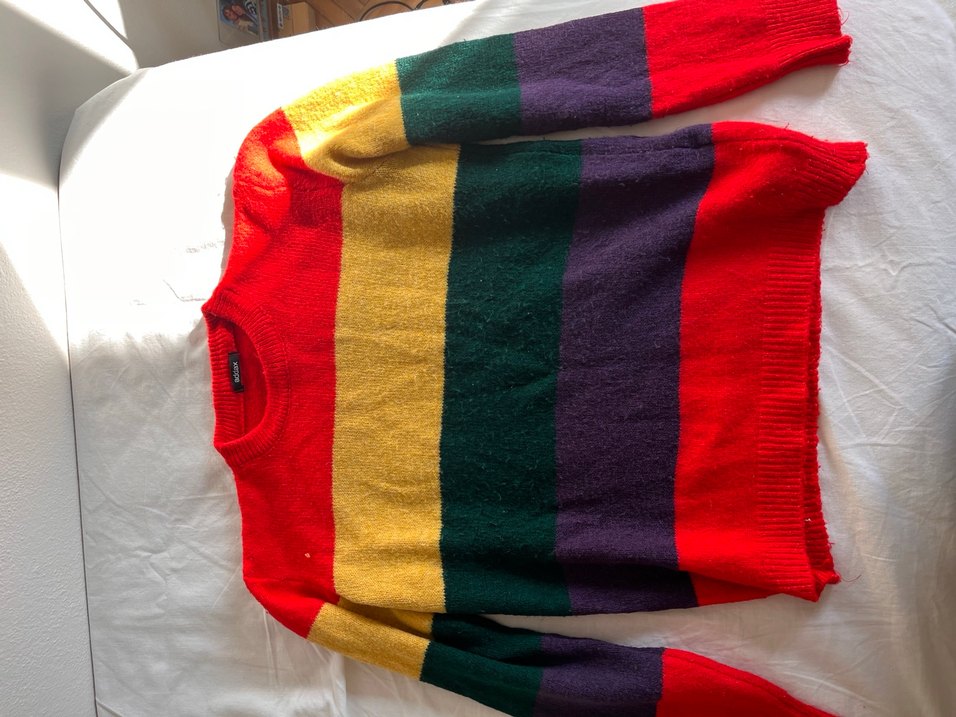 Bu kadın kazak, yünlü örgü yapısı, uzun kollu ve yuvarlak yaka detayları ile bol kesimdir. Canlı çok renkli yatay çizgiler taşır, günlük kullanıma uygundur.