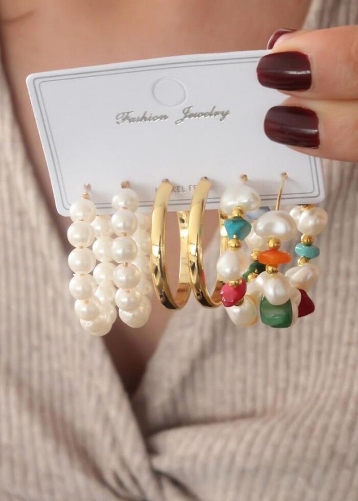 İnci Boncuklu Küpe Seti -Karışık Renkli Metal