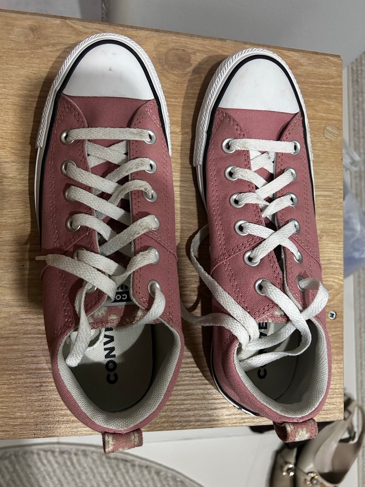 Pastel pembe renkte, bağcıklı ve düz tabanlı kadın spor ayakkabısı. Günlük kullanıma uygun, desensiz ve rahat bir modeldir. #converse