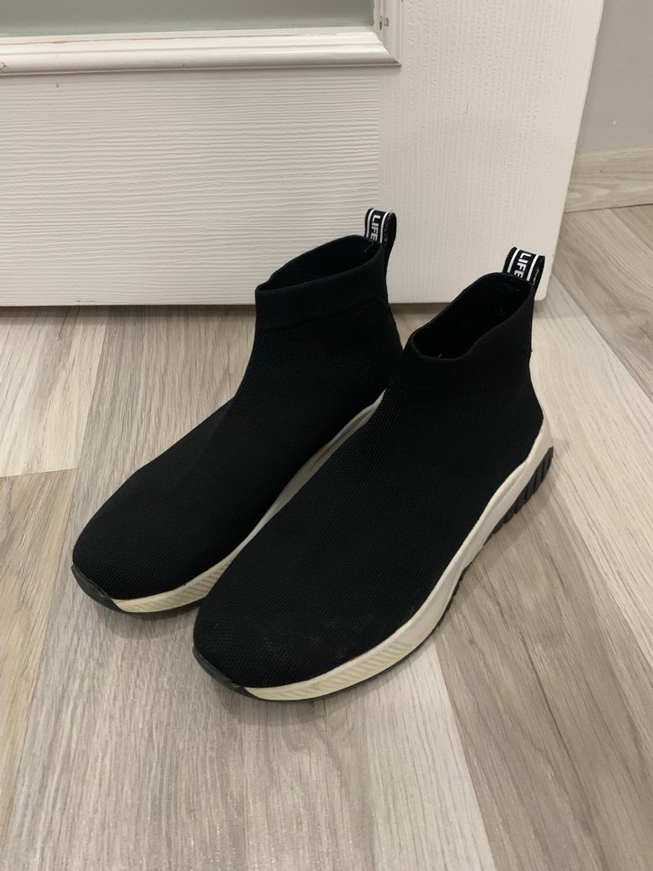 Siyah elastik yapıya sahip, dolgu topuklu ve kauçuk tabanlı kadın spor ayakkabısı, günlük kullanım ve sokak stili için uygundur.
