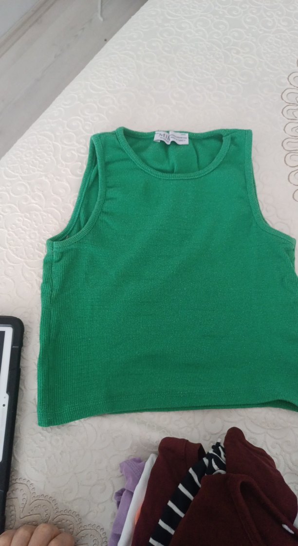 Parlak yeşil renkte, kolsuz ve yumuşak dokulu kadın crop